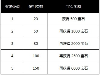 祭祀到一定次数(含免费次数)即可获得宝石奖励,详细见下表。